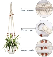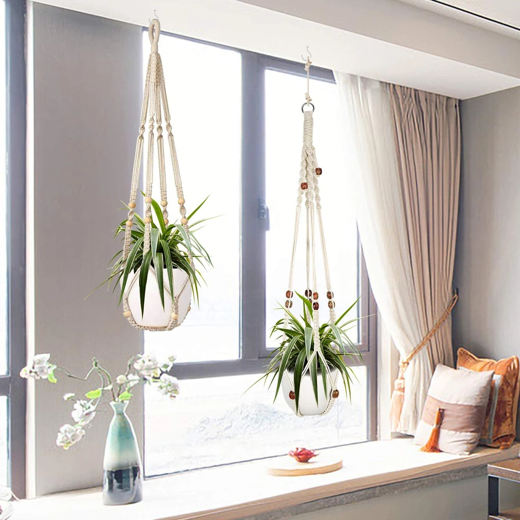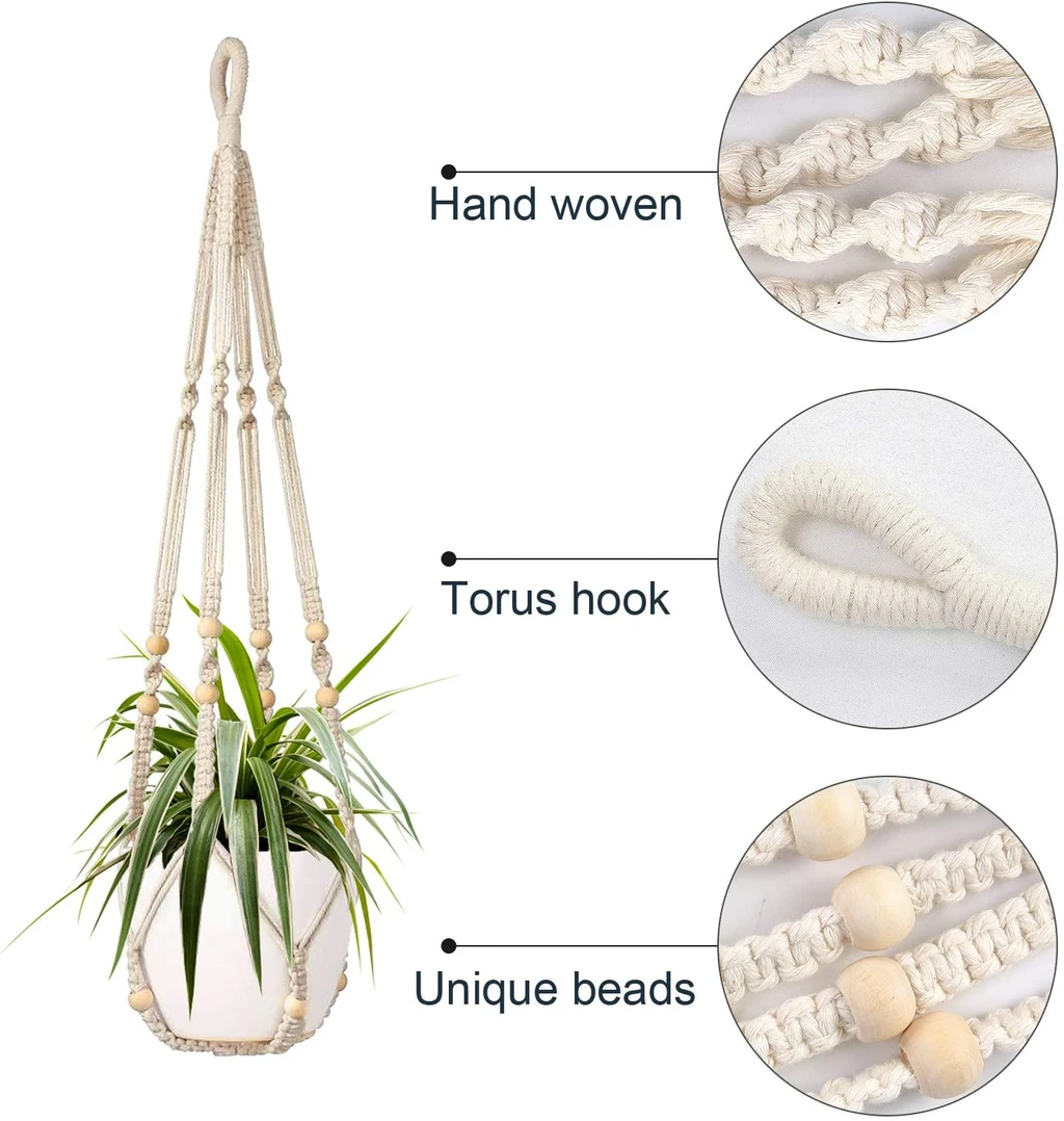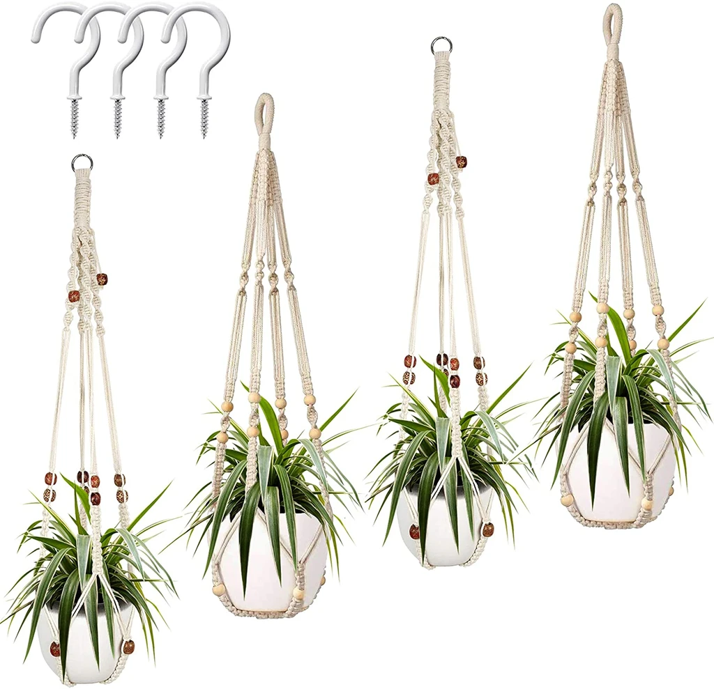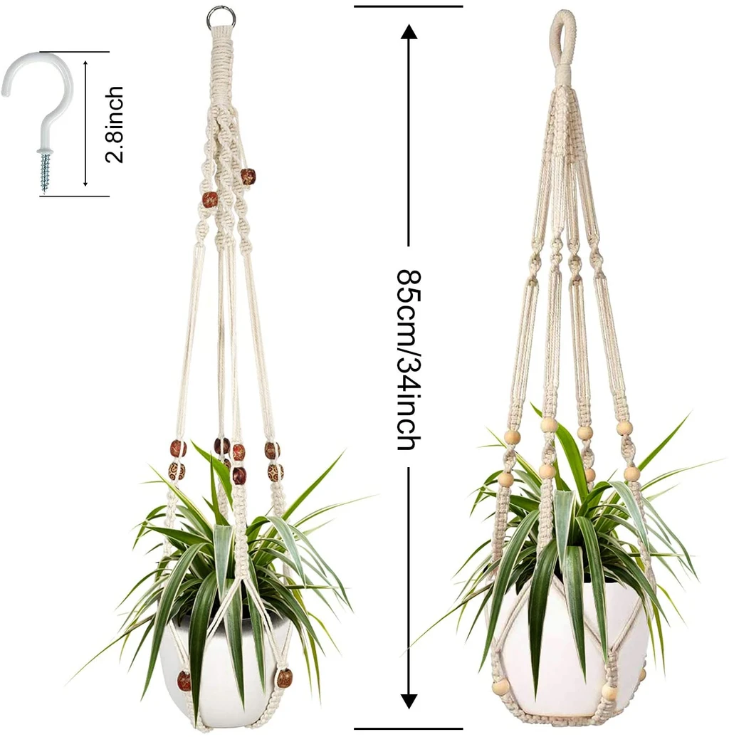 PACKAGE INCLUDES - 4 pcs plant hangers with wood beads decorative, can hold 4- 9inch flowerpot size at the bottom, with 4 pcs hooks, convenient for you to hang plants on a variety of occasions.