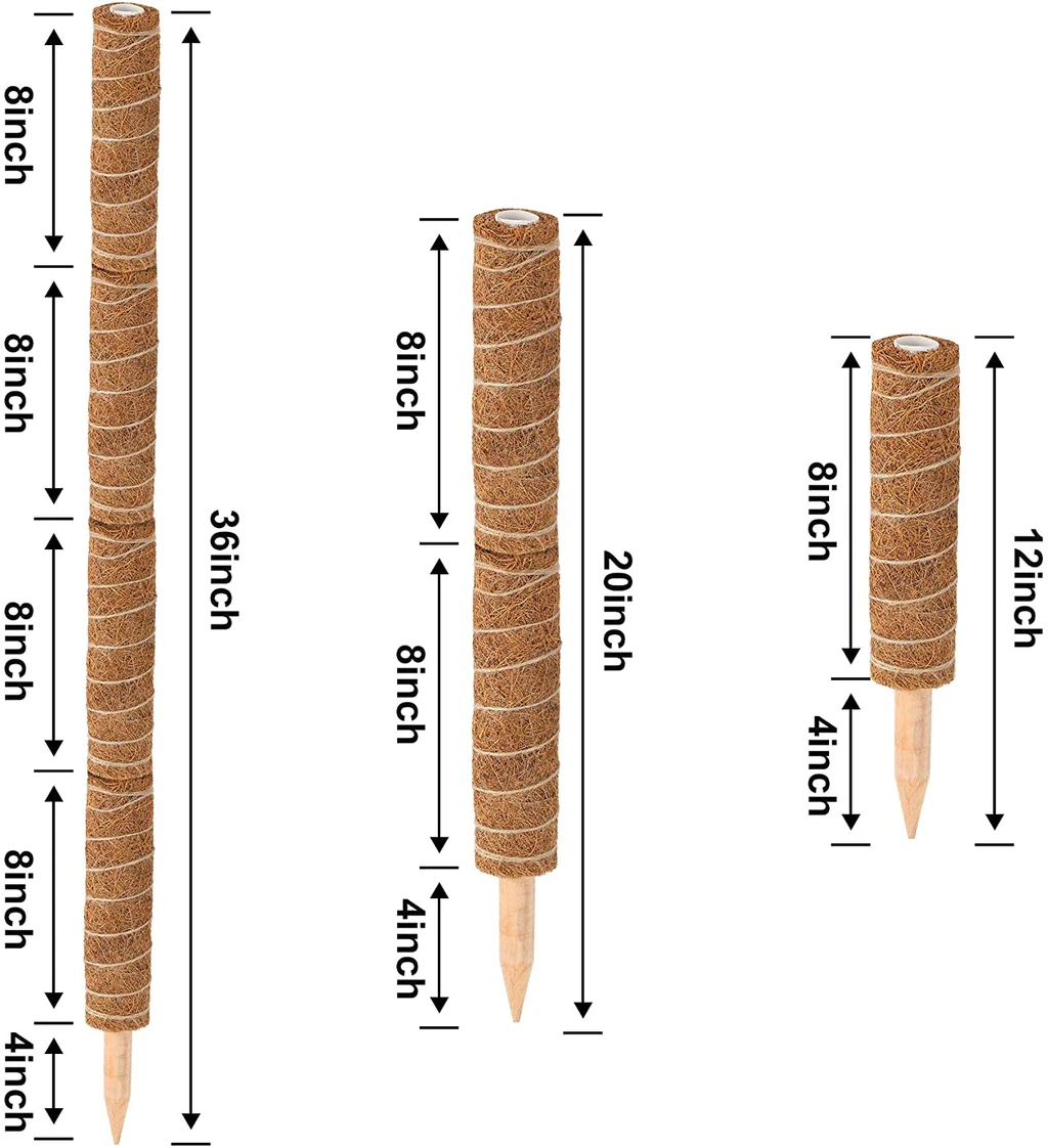 SUITABLE SIZE : 12" height per each coir pole includes 4” wood stick, diameter 2”. You can choose whether use it as 4 separated coir poles or to connect several coconut palm sticks together according to your desired length.